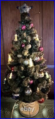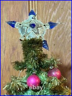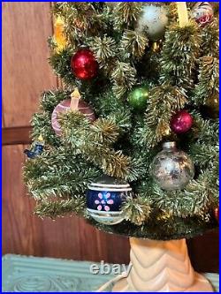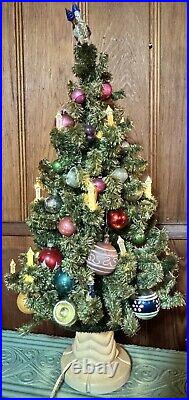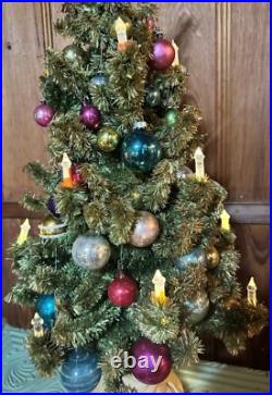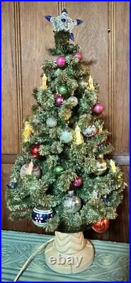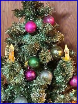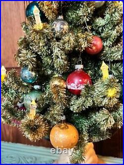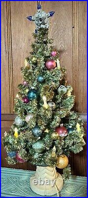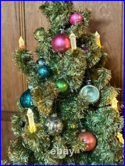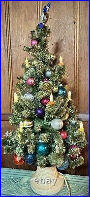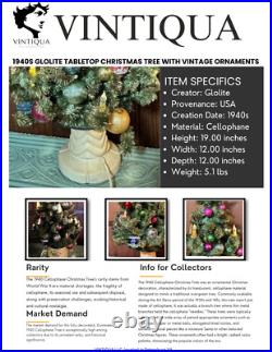 Add a touch of vintage charm to your holiday decor with this 1940s GLOLITE tabletop Christmas tree. Featuring a beautiful blue color and an all-over pattern, this large triangle tree shape is perfect for any Christmas occasion. The tree is made of celluloid material and is handcrafted with illuminated features, making it a unique addition to your collection. This original and authentic Christmas tree is perfect for adults and comes with a variety of vintage ornaments to add to its charm. The tree measures 28 inches in height and 13 inches in width, making it a great tabletop display piece.