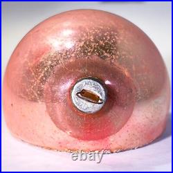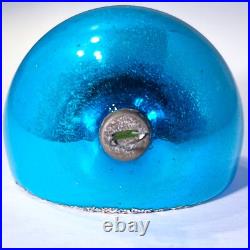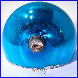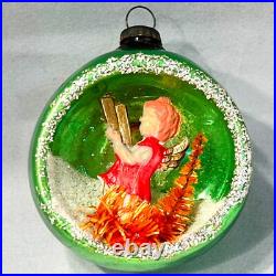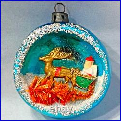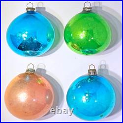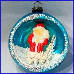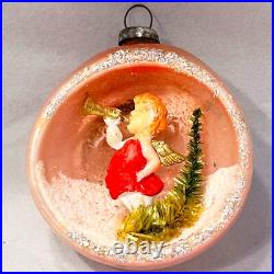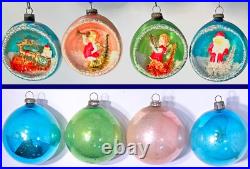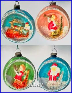 Four Rare Vintage 2 3-D Round Mercury Glass Diorama Christmas Tree Ornaments. Blue ball with Santa Claus, sleigh, reindeer, red bristle brush tree and mica crystal snow flakes. Pink ball with Angel playing trumpet, gold bristle brush tree and mica crystal snow flakes.