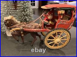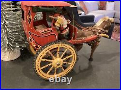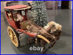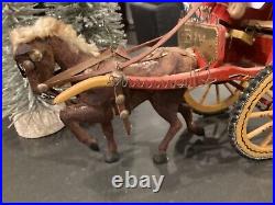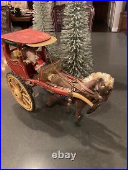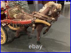 This antique vintage Santa Claus figure with a clay face and a felt chenille body. He is depicted riding in a horse and buggy, adding a nostalgic touch to the Christmas decor. Measures12 inches in length and 8 1/4 inches in height.