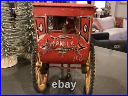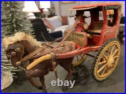 The Horse and Carriage/ Buggy is very nice made of wood and tin, the buggy has some silk fringe the wheels are wooden with rubber the horse has what I think is a silk mane and horse has a fuzzy brown hair that is rubbed off in places. This is truly a lovely folk art antique vintage piece to add to your collection.