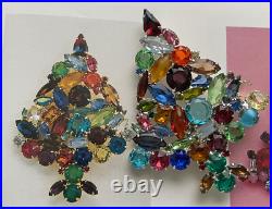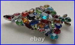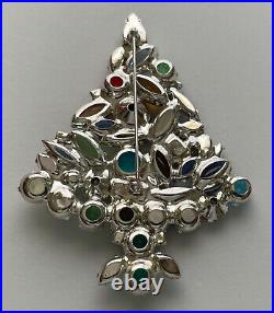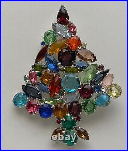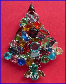 STUNNING, VERY RARE and HARD TO FIND, Mid-Century Modern Vintage Christmas Tree Brooch Pin, Unsigned Celebrity NY, Book Piece, (Without Molded Leaves Variation) Large Multicolored Rhinestones, Jelly Belly Stones, Givre Glass, Silver Metal, Prong Set, Circa 1960s - 1970s. Some expected vintage wear with age. SPECTACULAR, LARGE vintage Mid-Century Modern Christmas tree brooch for the collector!