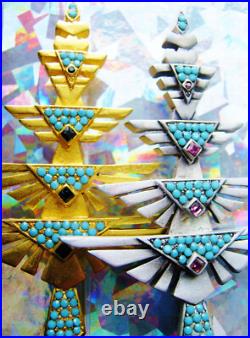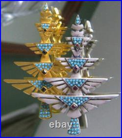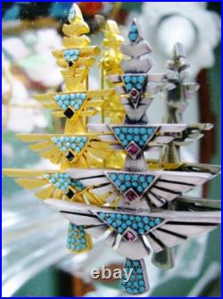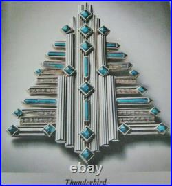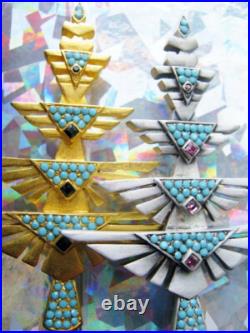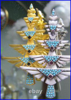 The latest Christmas tree pins book (see my interpretation of the Thunderbird tree in 1st image) plus a Thunderbird Christmas tree pin in either silvery metal or gold plated. The book tree (1st image) is my fantasy design, along with many others in a dream forest of jeweled pines. The actual tree here is a rare 1940s design and is signed by one of the foremost costume jewelry designers ever. You receive both the book (see first image) and the brooch in second etc. The silvery finish might have some age tarnish.