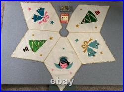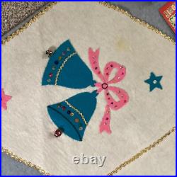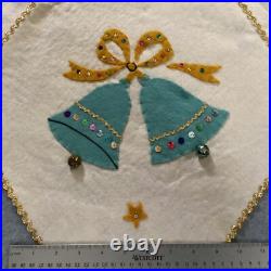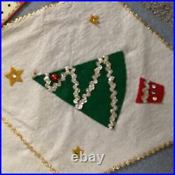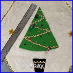 There are two Christmas trees that are embellished with real mini glass shiny bright Christmas tree ornaments, and there are several extras that will come along with this 5 paneled five star Christmas tree skirt. Two panels have multicolor bells with real metal jingle bells attached. Each panel is edged with a gold rick rack trim. There are a couple of spots to the felt that I have not attempted to clean.
