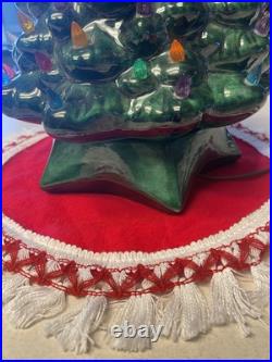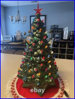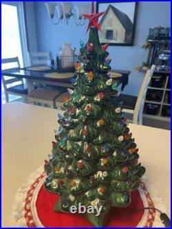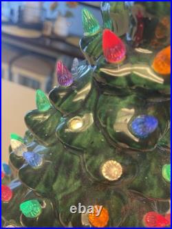 Add a touch of vintage charm to your holiday decor with this beautiful green Holland Mold ceramic Christmas tree. The 21-inch tall tree features a star base and is adorned with lights that create a warm and festive glow. This artificial tree is made of high-quality ceramic material and is a great addition to any Christmas collection. The tree is perfect for both Christmas and seasonal decoration. It is handmade and electric, making it a unique and special piece.