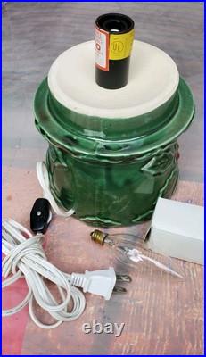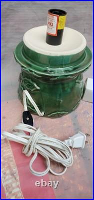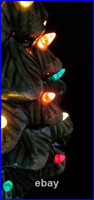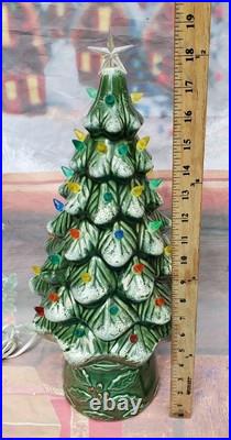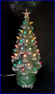 Vintage Ceramic Christmas Tree, Large 17 Inch Table Top Tree, Multi Colored Lights, Retro Green Flocked, with holy design base. Mid Century Kitsch colored bulbs are stationary.