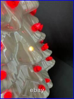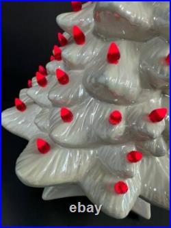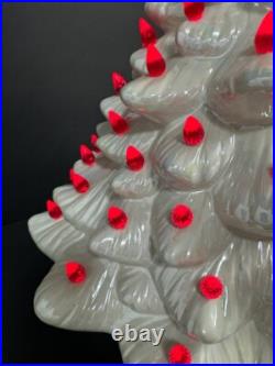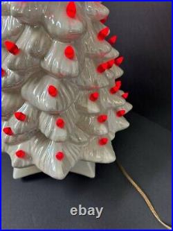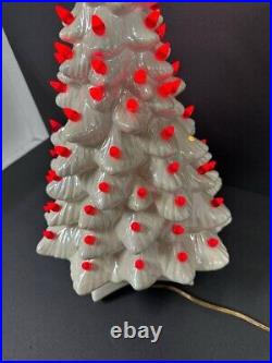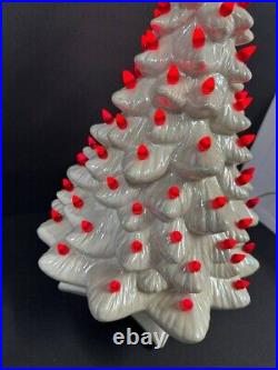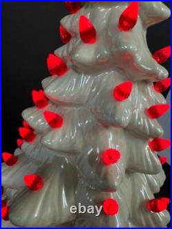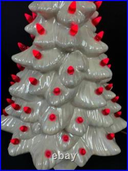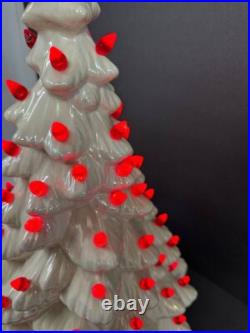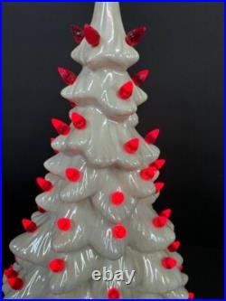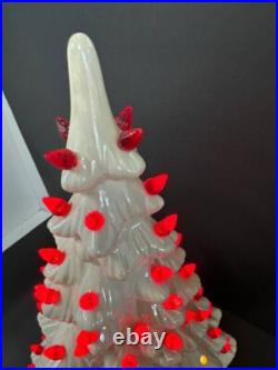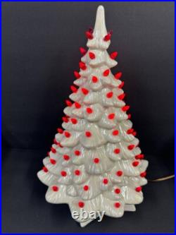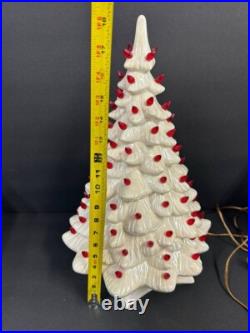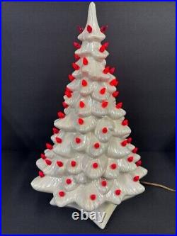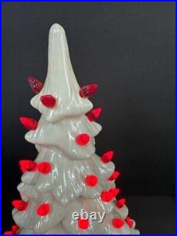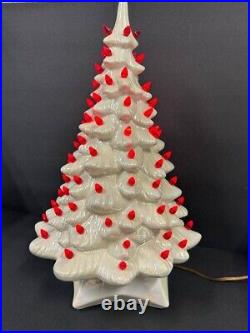 This vintage 18 ceramic lighted Christmas tree is a beautiful addition to your holiday decor. The tree features a white color with a red scene of the nativity, adding a touch of tradition to your festive display. The tree stands at a height of 18 inches and is perfect for any Christmas occasion.