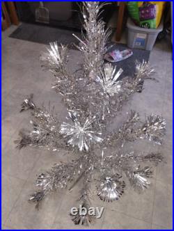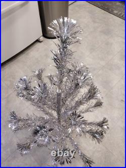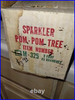 There were a couple branches that probably need a new piece of tape to hold the aluminum from sliding. The product is a vintage 1960's Pom Pom The Sparkler M-325 Aluminum Christmas Tree, standing at 3 feet tall and colored silver. Manufactured by the brand Star in the United States, this artificial tree is designed in a unique pom pom style, making it a standout piece for Christmas decor.