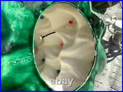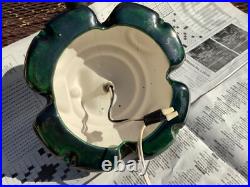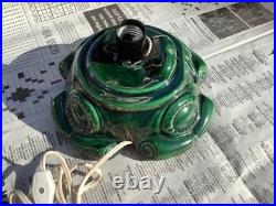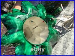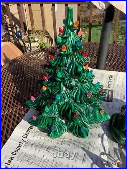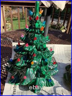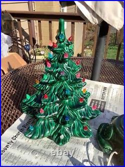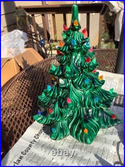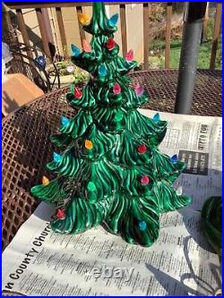 Pre owned ceramic Christmas tree with base and lights. Some of the tree lights seem to be glued in place. See photos as they are part of the description. No chips, cracks, or crazing visible. On the underside of the tree, in the interior rim, there are some small chips that might be from the maker.