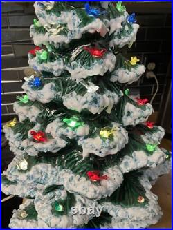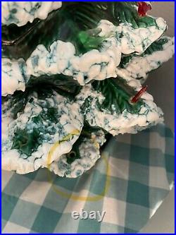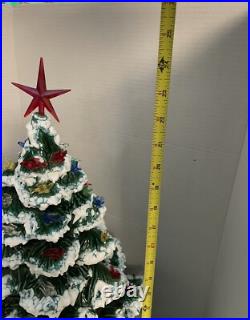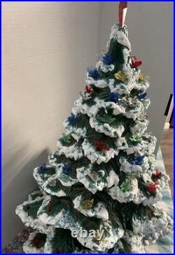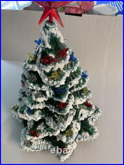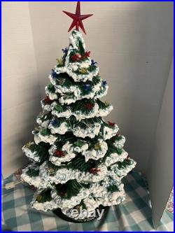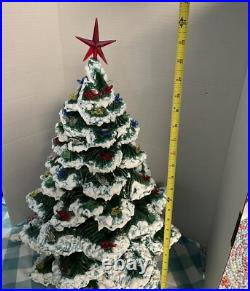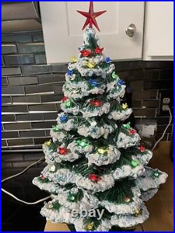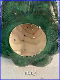This beautiful vintage Ceramic Lighted Christmas Tree is a true treasure for any collector or lover of unique Christmas decor. Standing at 22 inches tall, this handmade tree has been carefully crafted and decorated with snow edges, adding a touch of whimsy to any space. The green tree features colorful lights that give off a warm glow, creating a cozy and festive atmosphere. Made in the United States in the 1970s, this tree is a timeless piece that will bring joy to your home for many years to come. Perfect for Christmas lovers, this item is a must-have for anyone looking to add a touch of vintage charm to their holiday decor. Item is 3 pieces, missing 1 light.