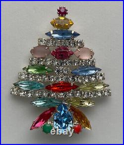 An absolutely stunning brooch in person. Beautifully designed with rows of multicolored rhinestones in different shapes and textures in between rows of clear rhinestones. Two small red & green cabochons accent the rhinestone base. A lovely, unique Christmas tree pin.