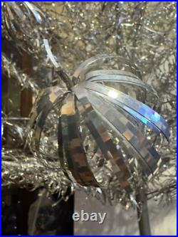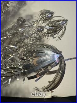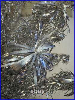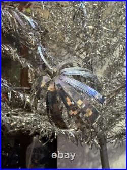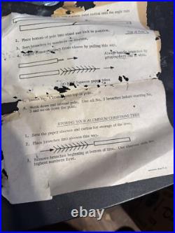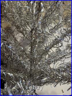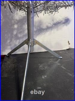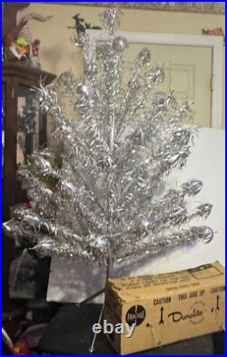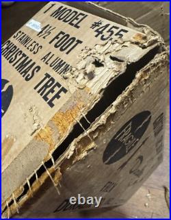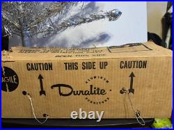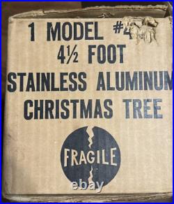 Vintage Duralite 4.5' Aluminum Christmas Tree With Original Box incomplete #455. Gorgeous mid-century aluminum tree with pom pom style ends. Has silver wooden pole & claw tree stand. Box has damage on one end.