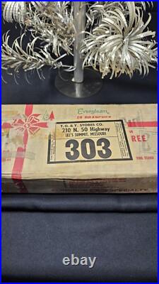 Unfortunately this tree does have some yellowing/discoloration on the branches. The wood trunk has some wear to it as well. These flaws are shown clearly in the photos! IT IS MISSING ONE BRANCH! Original box shows wear throughout! The original branch covers are included! Please view all pictures carefully, they are the best description!