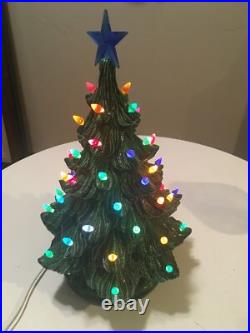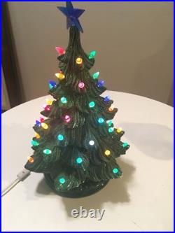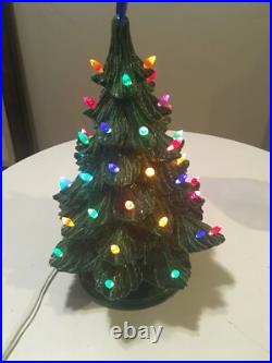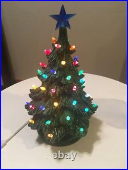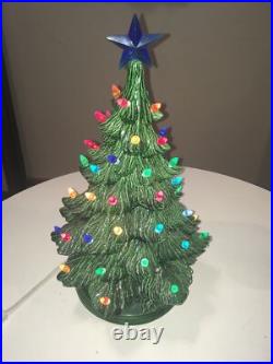 The tree is artificial, but looks and feels like the real thing. Crafted with care in the United States, this ceramic tree is a wonderful addition to any holiday collection. The tree is lit up and features a seasonal theme, making it perfect for Christmas. Whether you're a collector or just looking for a unique decoration, this vintage green ceramic lighted Christmas tree is sure to bring joy to your home.
