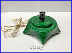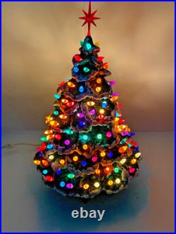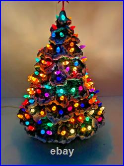 The star base has one small chip on the underside of one corner. Original wiring and cord included and work - but new owner may want to check and redo the wiring to the light bulb socket. I will include the plastic tree bulbs/lights removed and in a baggie. Tree on base is 16.5 tall.