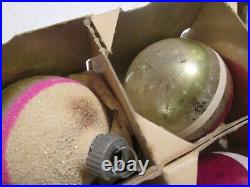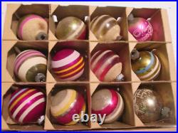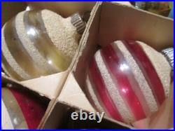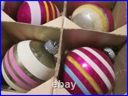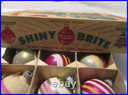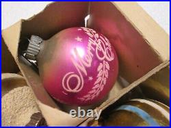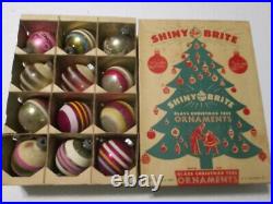 Vintage Shiny Brite Christmas Tree Ornaments. Mercury Glass Hand Painted and mica Stripes and hand painted stripes. 1 "Merry Christmas" and 1 "Silent Night". All are marked on the caps "Shiny Brite Made in USA".