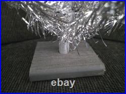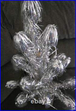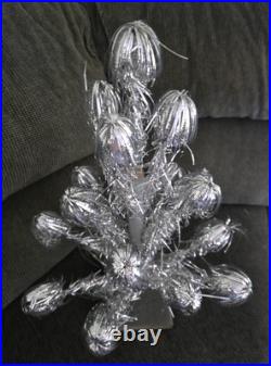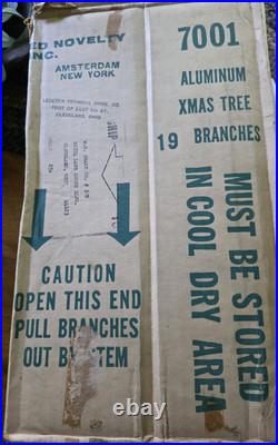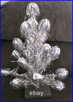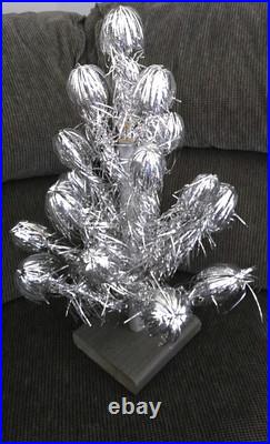 This vintage aluminum Christmas tree stands at 1.5 feet tall (20in in stand) and features 19 pom pom branches, making it a unique and collectible piece for holiday enthusiasts. Manufactured by Consolidated Novelty Co in the 1950s, this undecorated tree comes in its original box, adding to its charm. The silver color and novelty theme give it a retro feel that is sure to add character to any Christmas display. Made of aluminum, this artificial tree is a durable and long-lasting addition to your holiday decor.