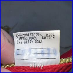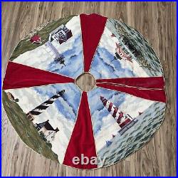 VTG Christmas Tree Skirt Wool Round Nautical Tapestry Needlepoint Lighthouses- LIGHT DISCOLORATION ON RED AREA NEAR OPENING- SEE PHOTOS- NOT BAD.