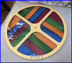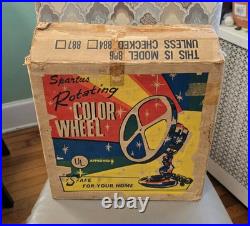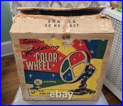 For sale is a rare Vintage Christmas Tree Light Spartus Rotating Color Wheel Aluminum in working condition. Item was tested, lit up, and moved. Motor makes a loud whining noise, so it may need lubricated. Color Wheel itself shows signs of wear, including waves, tape, and cracks. Box shows signs of wear from age and storage.